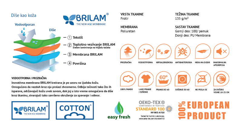JERSEY COTTON 100% prirodna pamučna vlakna. Pamuk je jedno od najstarijih vlakana koja se koriste u proizvodnji tekstila. Ova specijalna vlakna su uvek veoma vredna zbog svoje mekoće. Zapravo, "pamuk", na starom hindu jeziku, znači "fina vlakna". Stvorili smo JERSEY COTTON upravo zbog ovih karakteristika koje ga odlikuju ultra finom površinom i prijatnim dodirom. Osim toga, uz pamuk je leti izuzetno hladno, zimi toplo i uvek tiho i udobno. Potpuno vodootporna, prozračna i čuva od grinja, zahvaljujući inteligentnoj BRILAM membrani.